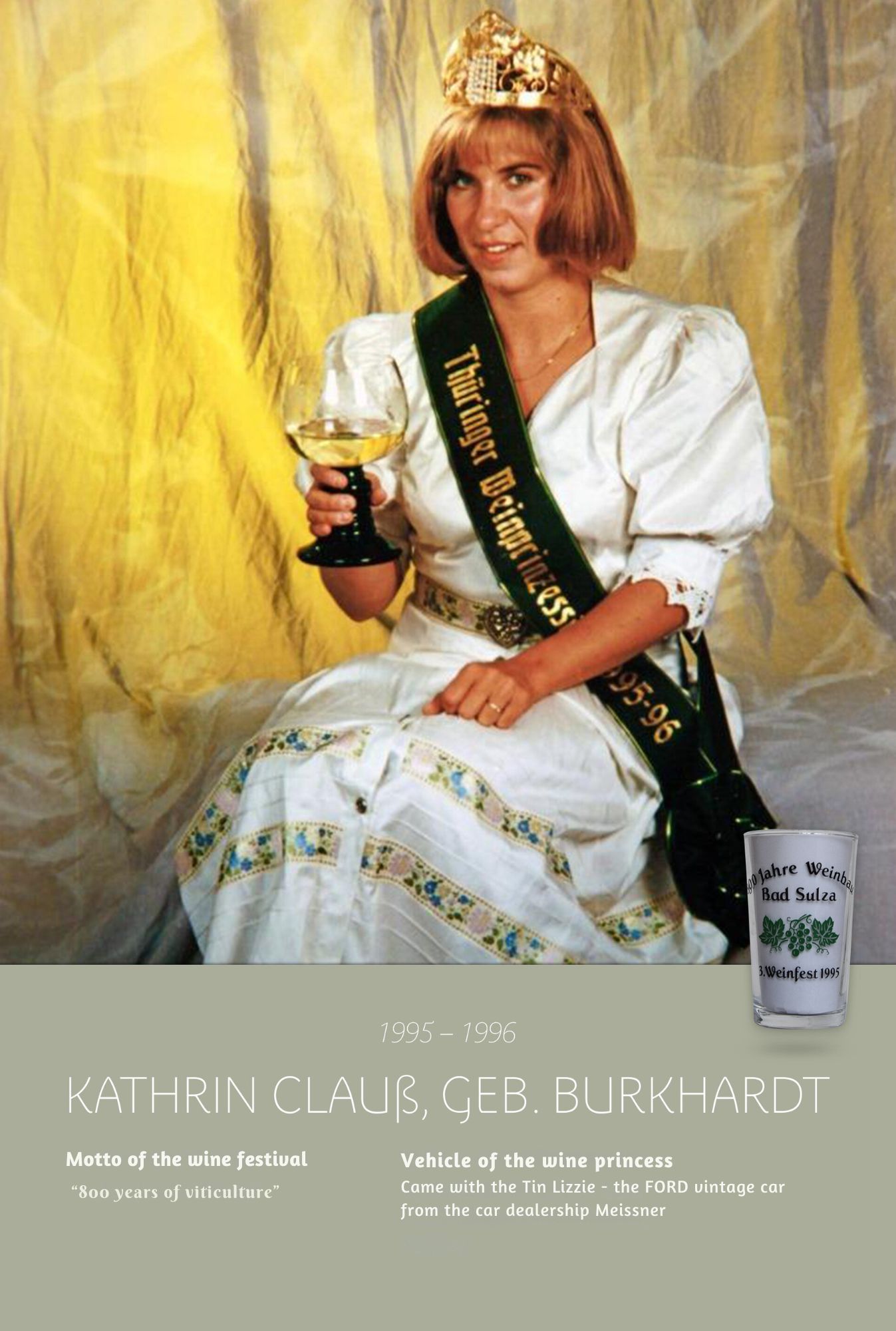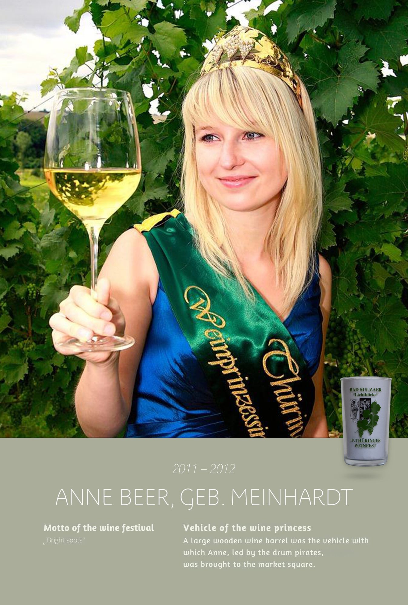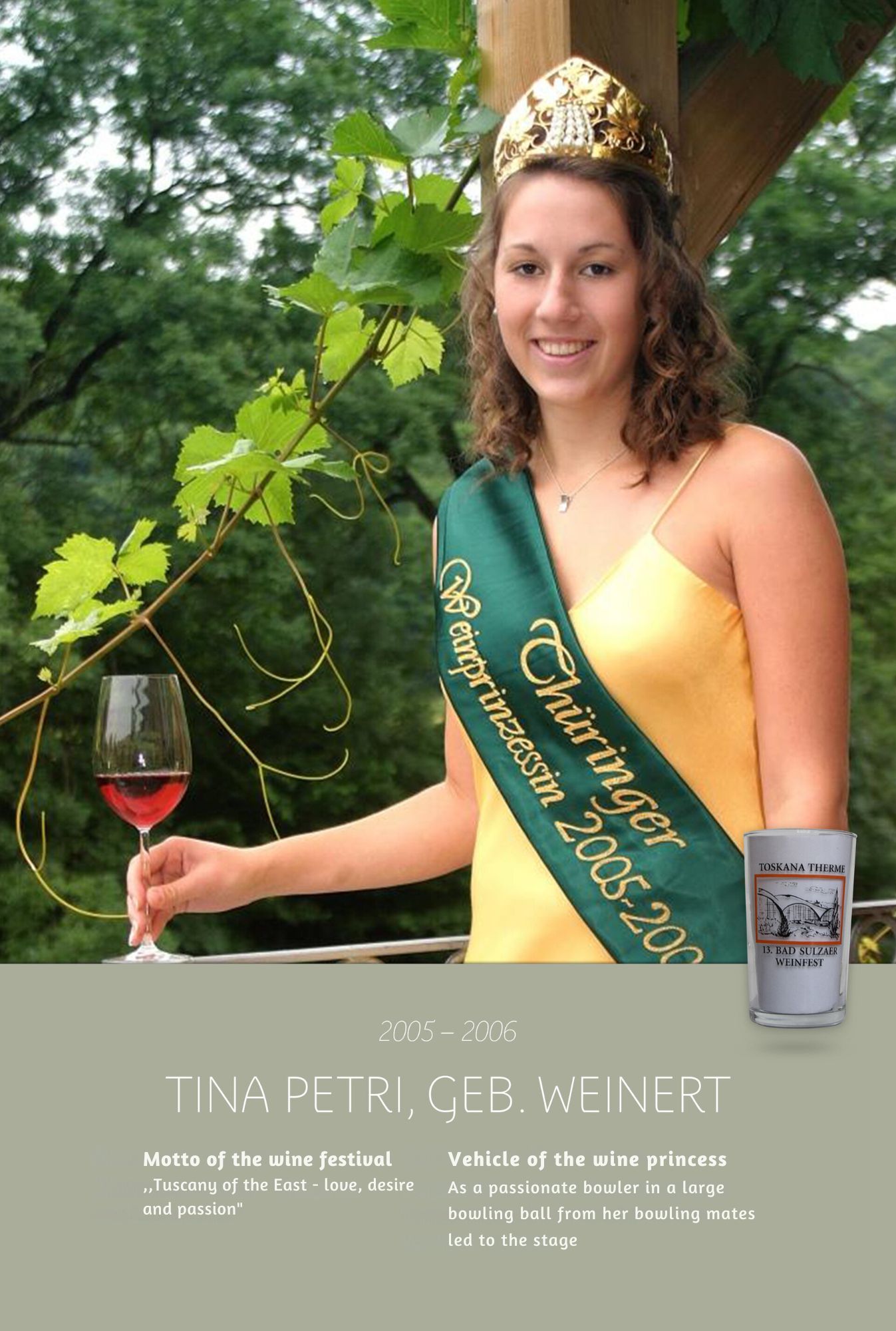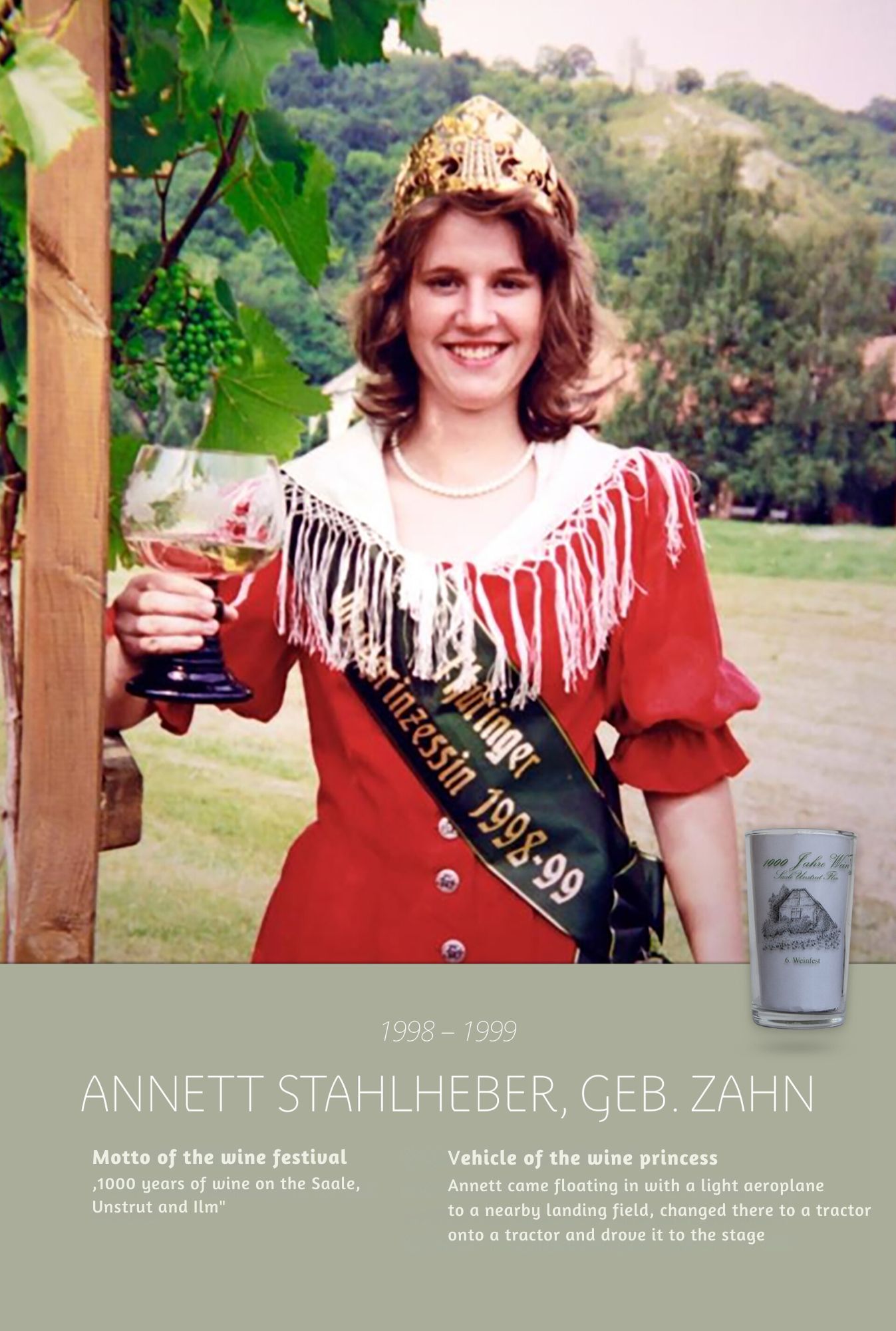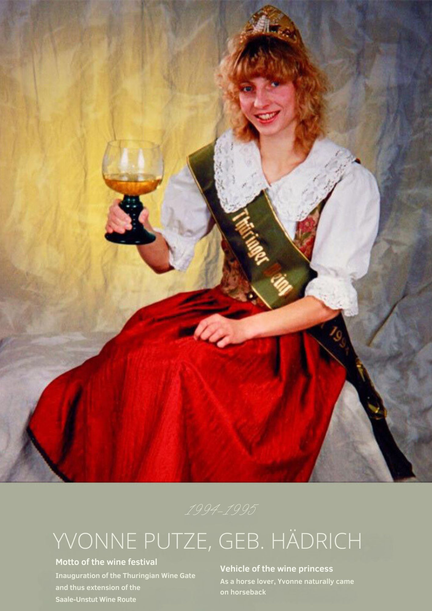 Since the first wine festival in 1993, nearly 30 Thuringian wine princesses have had the honour of wearing a crown and, during their reign, representing Thuringian wine and the wine town of Bad Sulza at numerous events.
