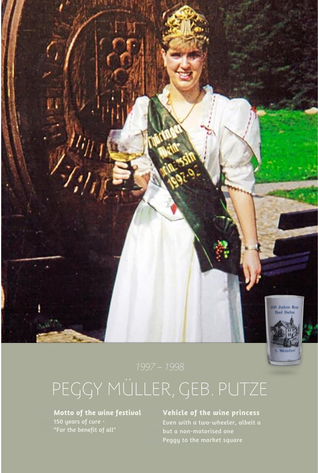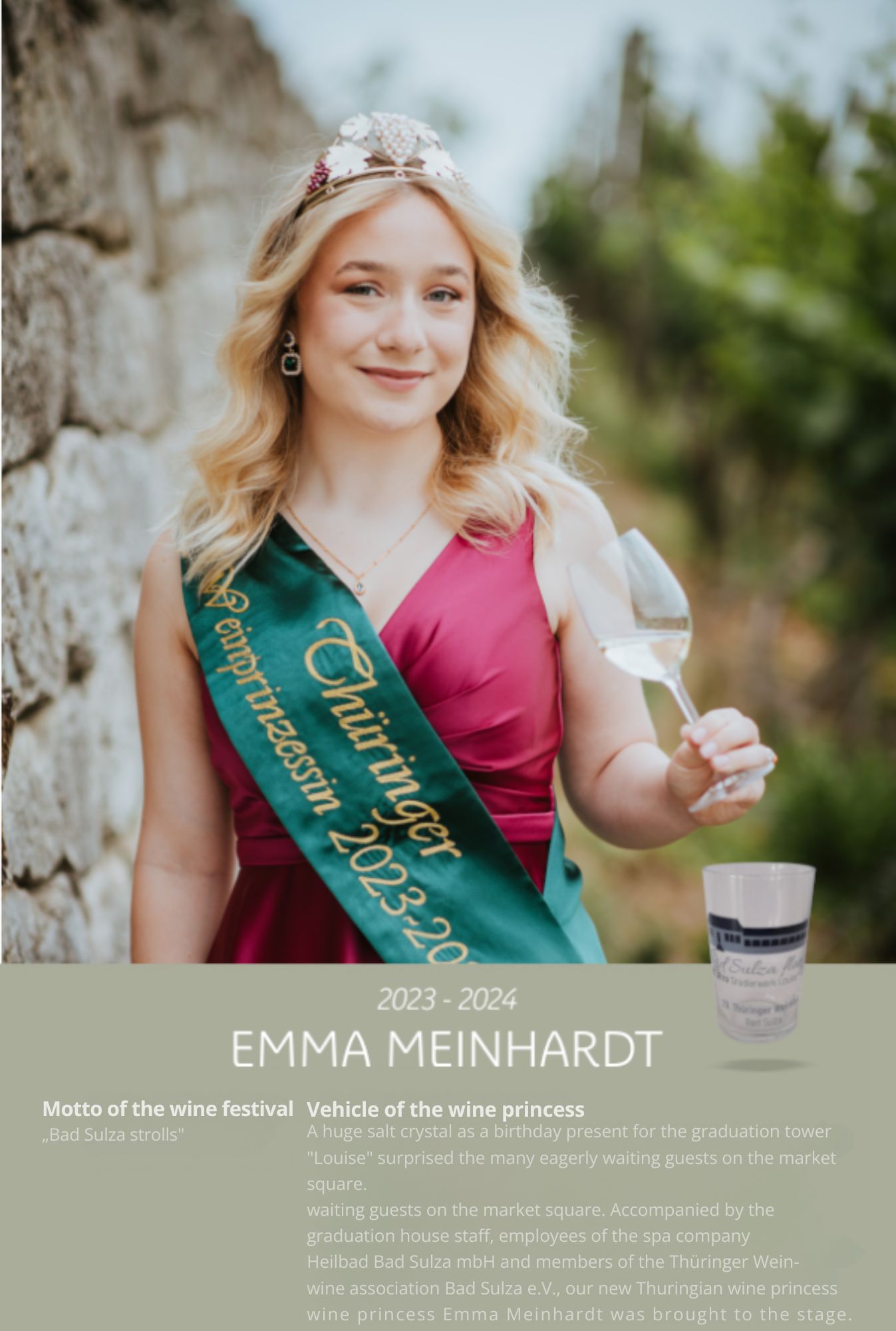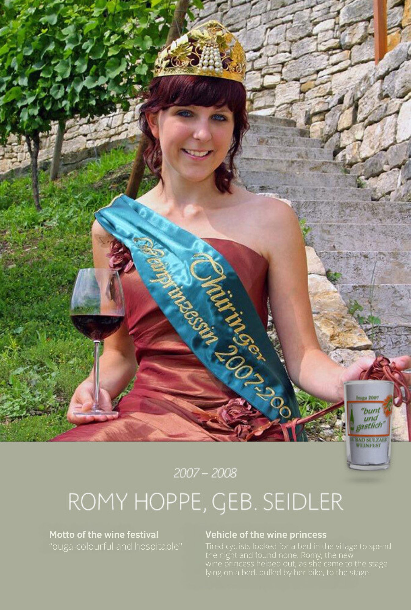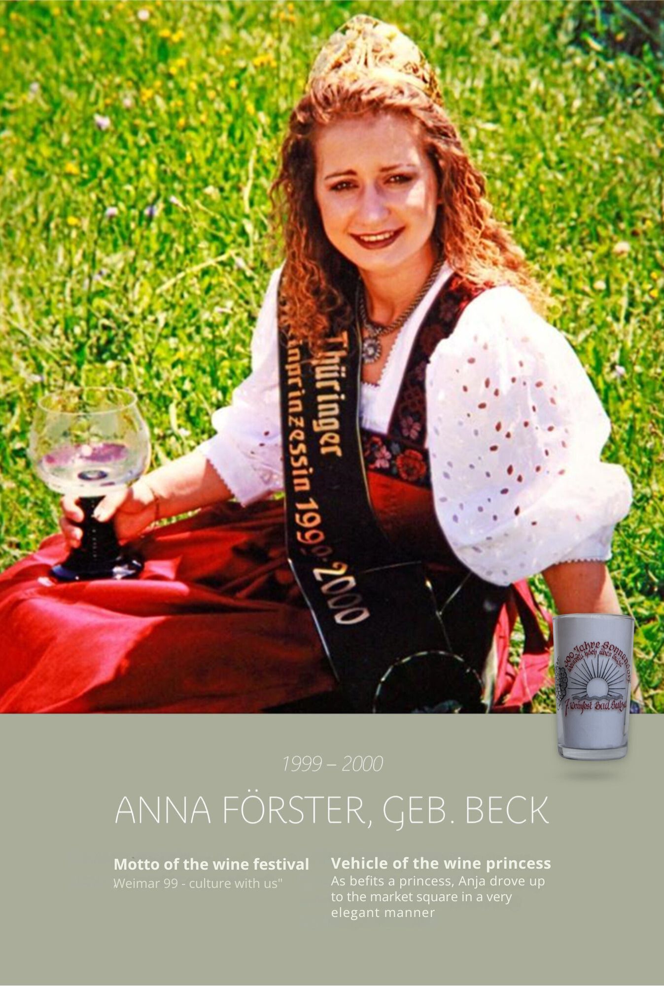 Since the first wine festival in 1993, nearly 30 Thuringian wine princesses have had the honour of wearing a crown and, during their reign, representing Thuringian wine and the wine town of Bad Sulza at numerous events.