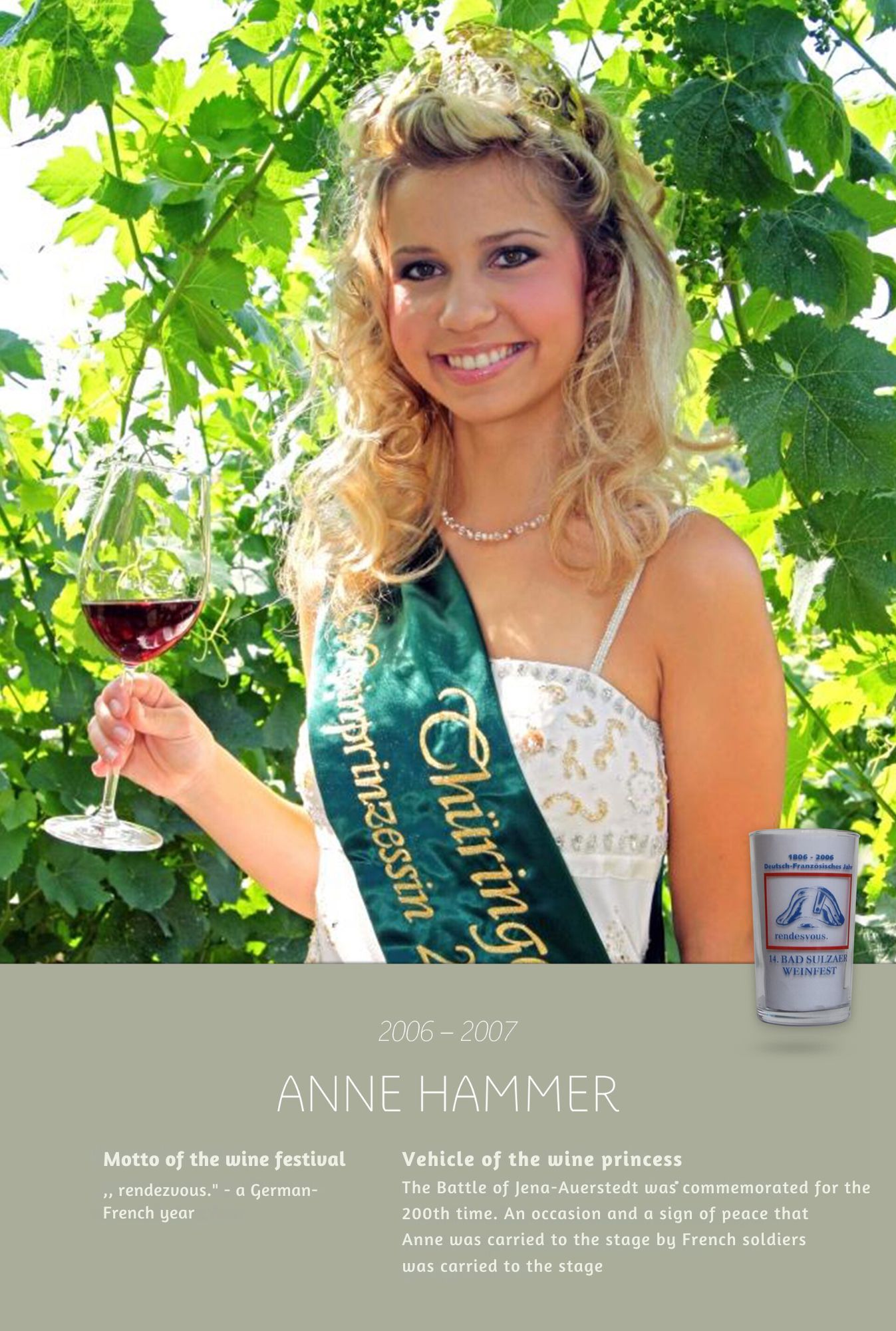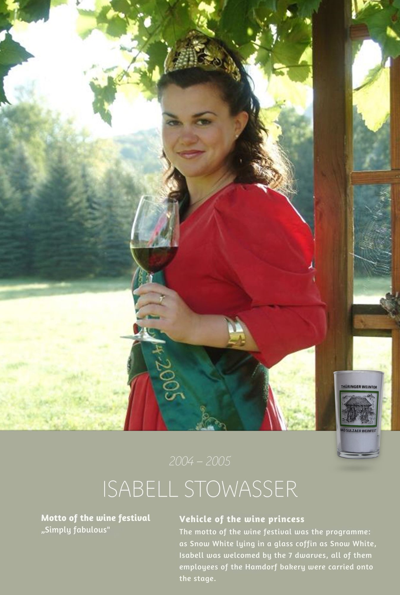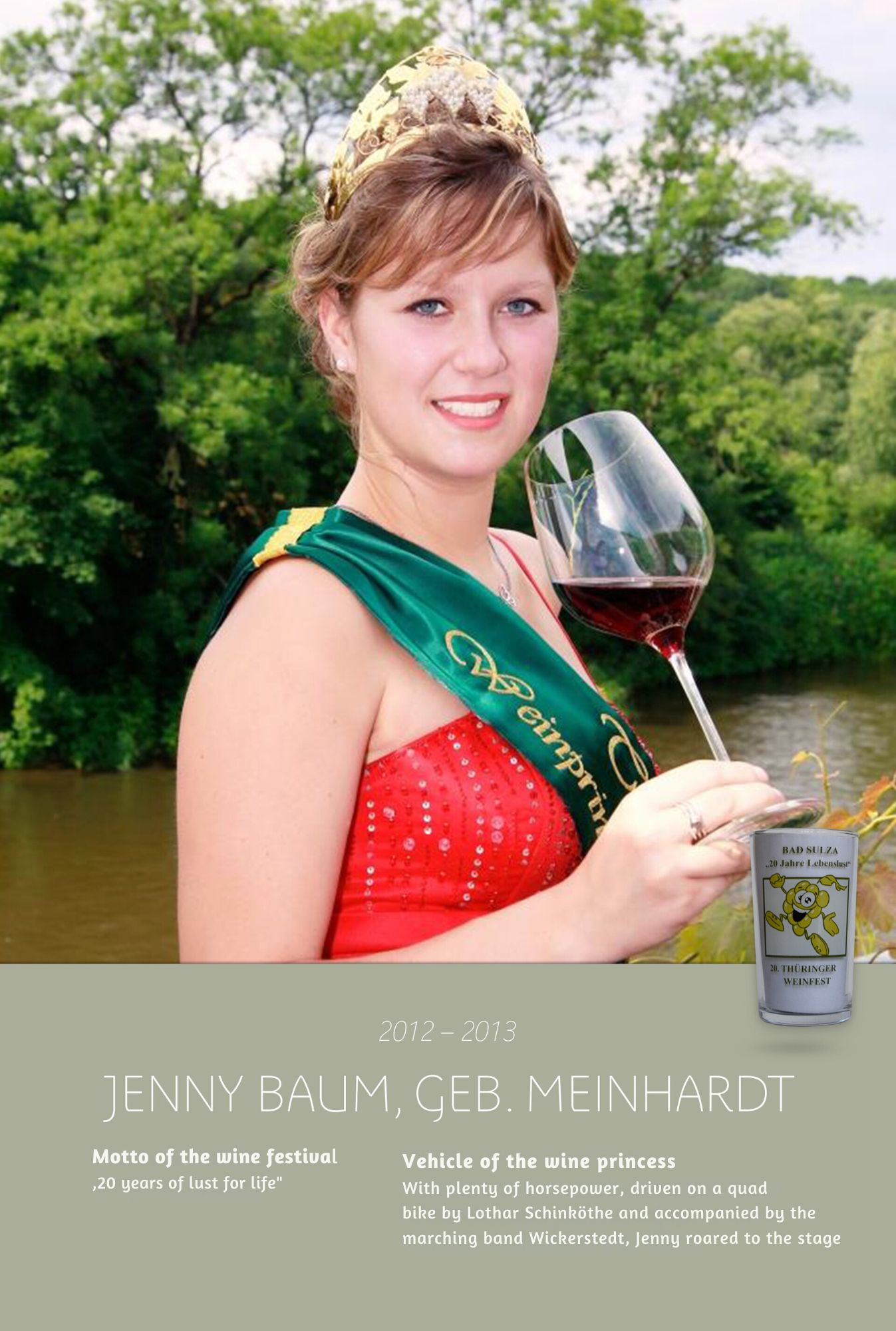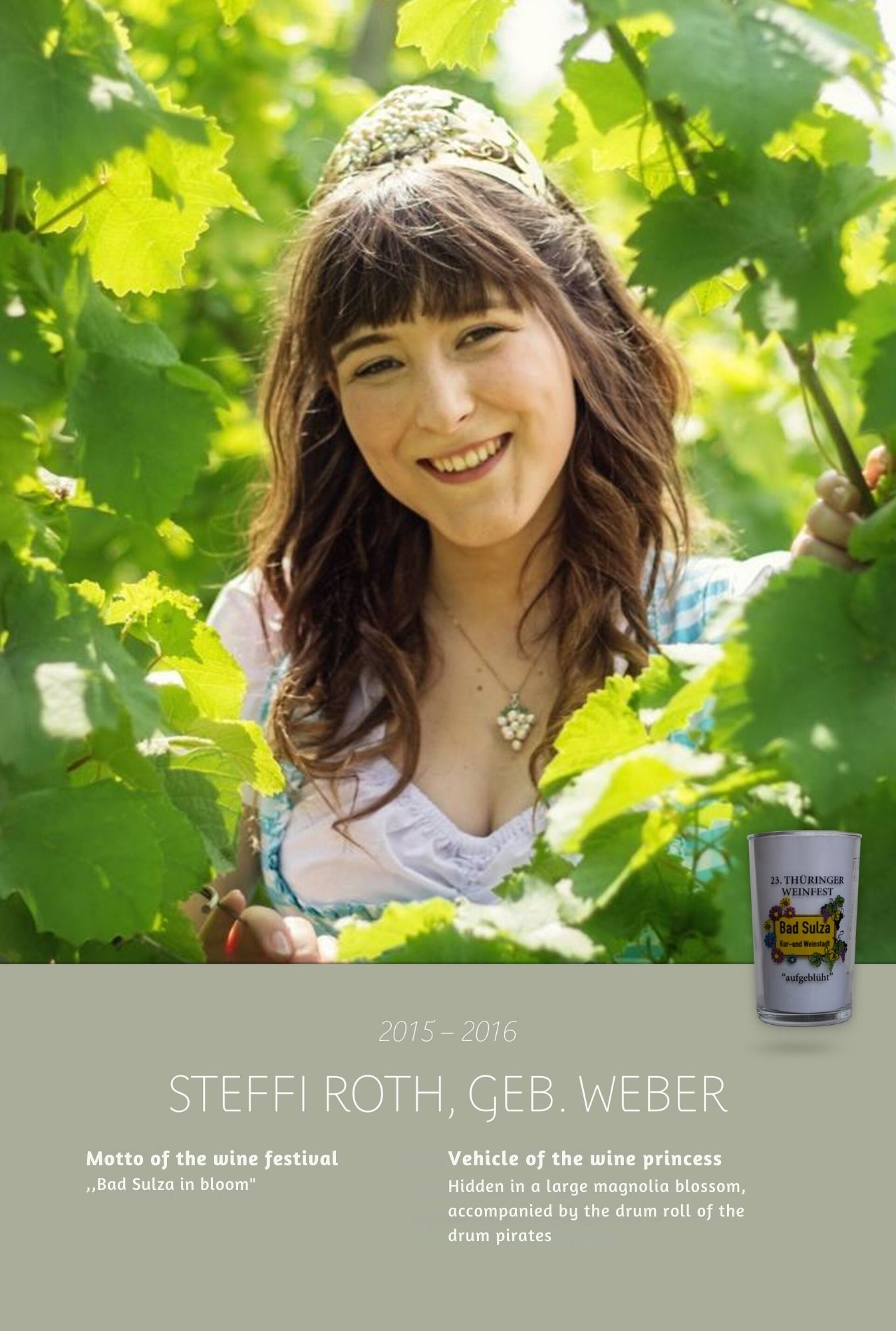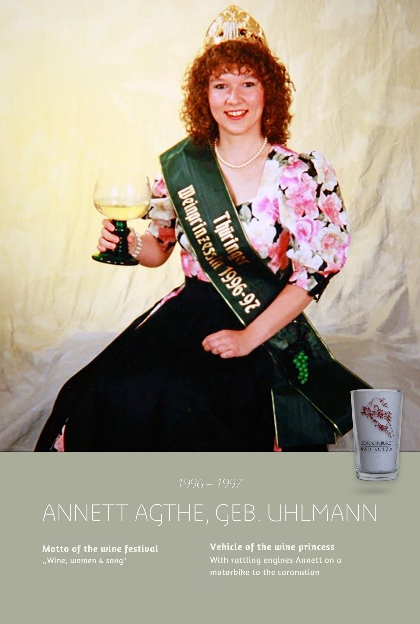 Since the first wine festival in 1993, nearly 30 Thuringian wine princesses have had the honour of wearing a crown and, during their reign, representing Thuringian wine and the wine town of Bad Sulza at numerous events.