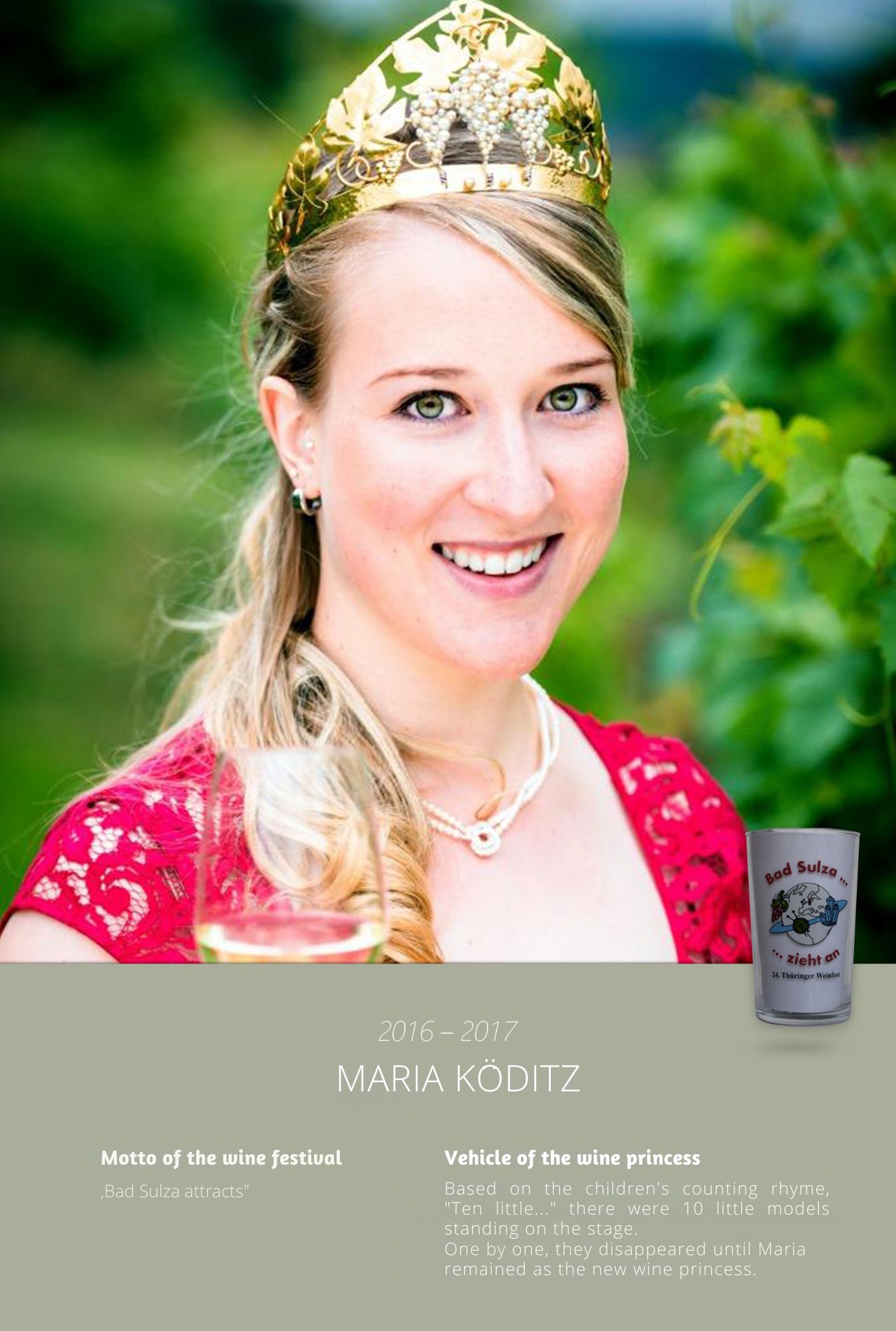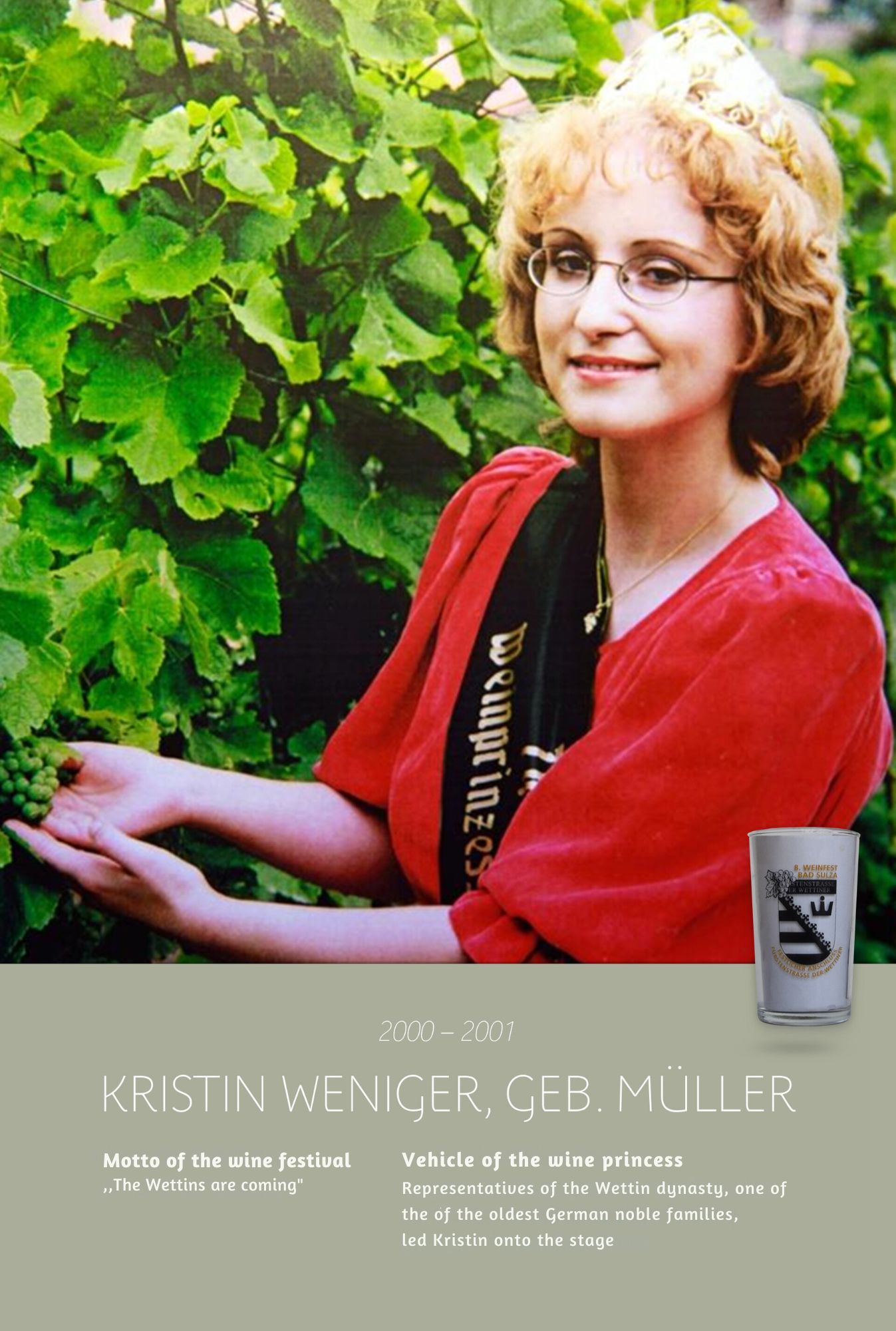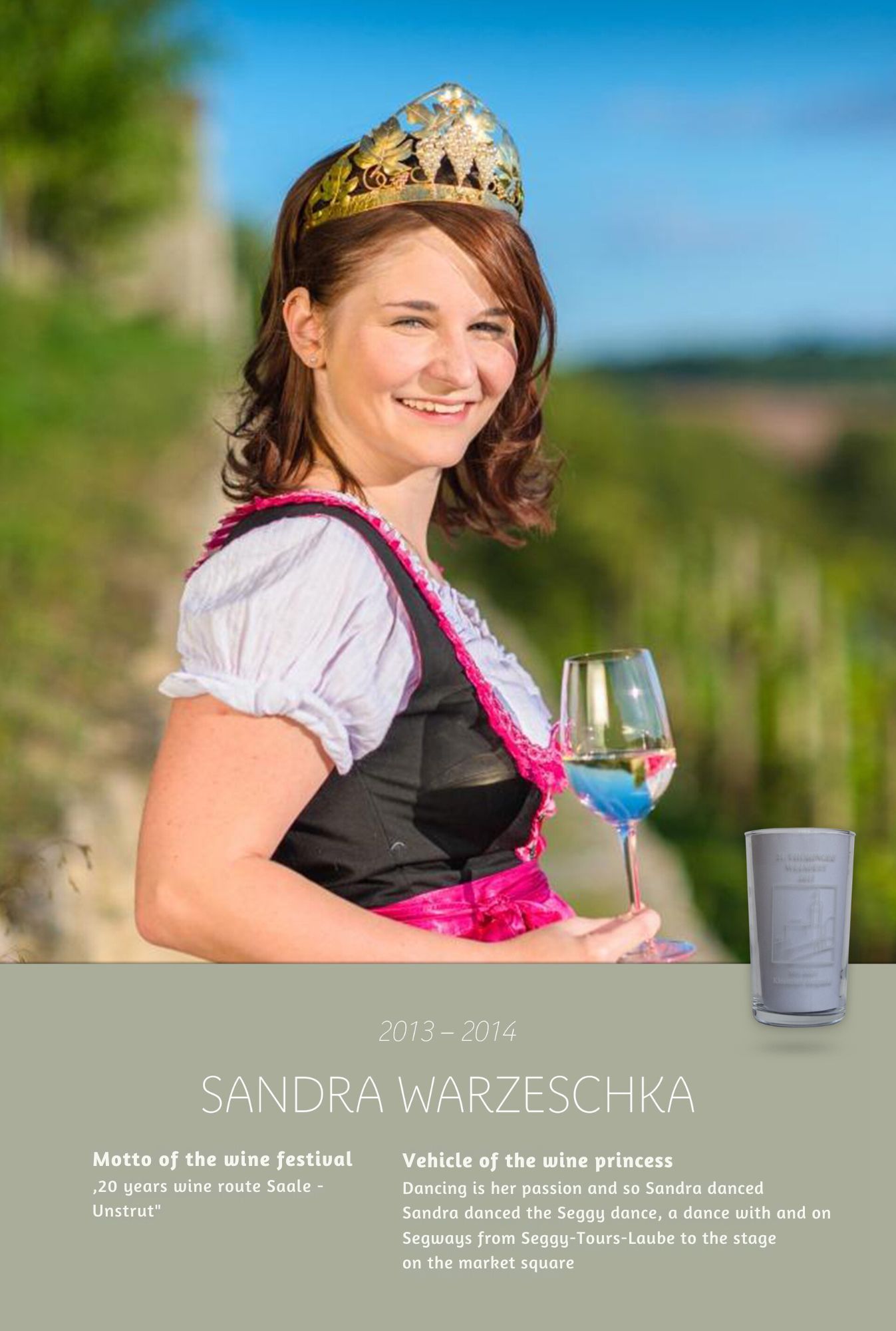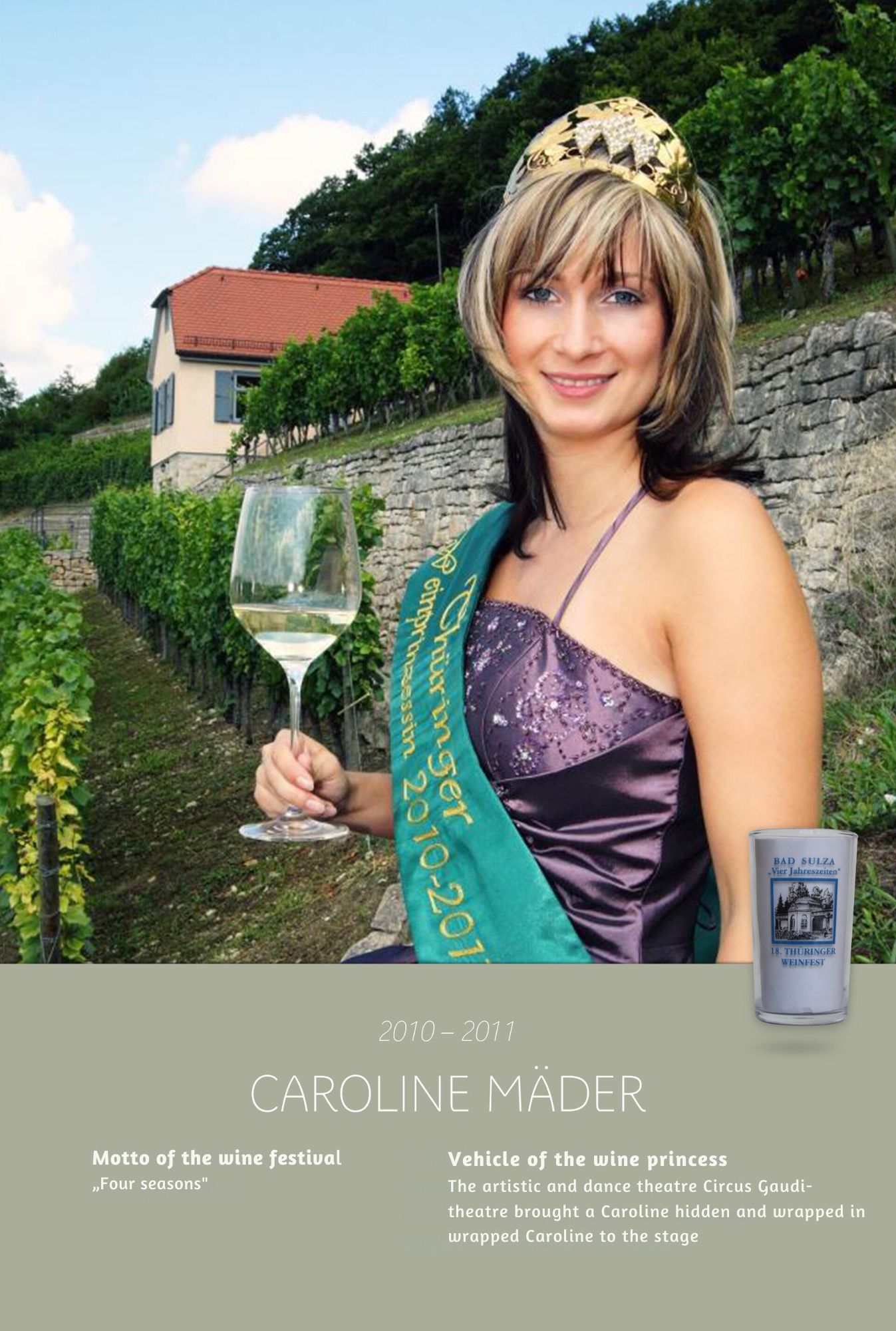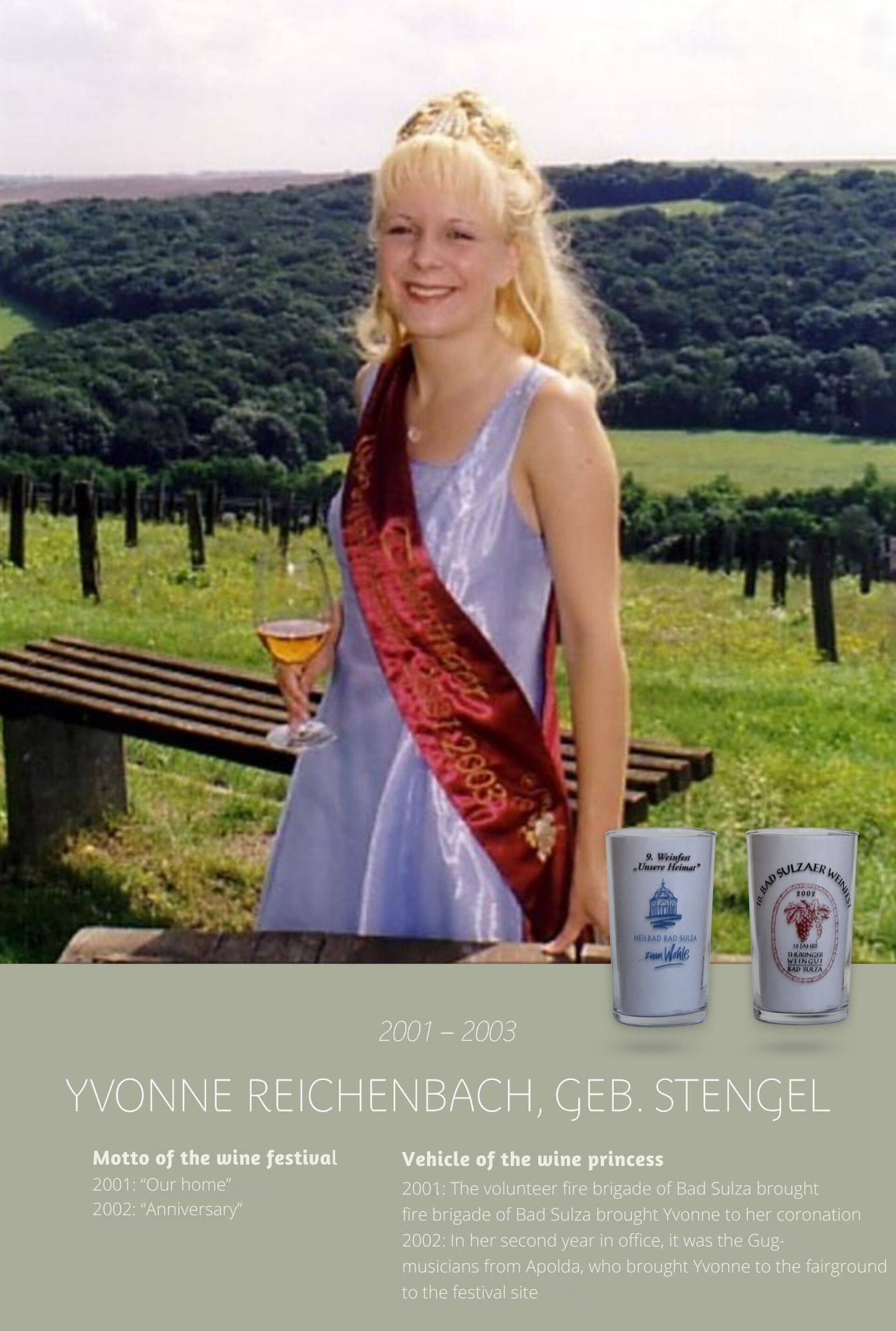 Since the first wine festival in 1993, nearly 30 Thuringian wine princesses have had the honour of wearing a crown and, during their reign, representing Thuringian wine and the wine town of Bad Sulza at numerous events.