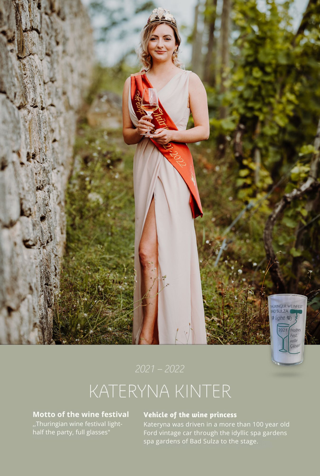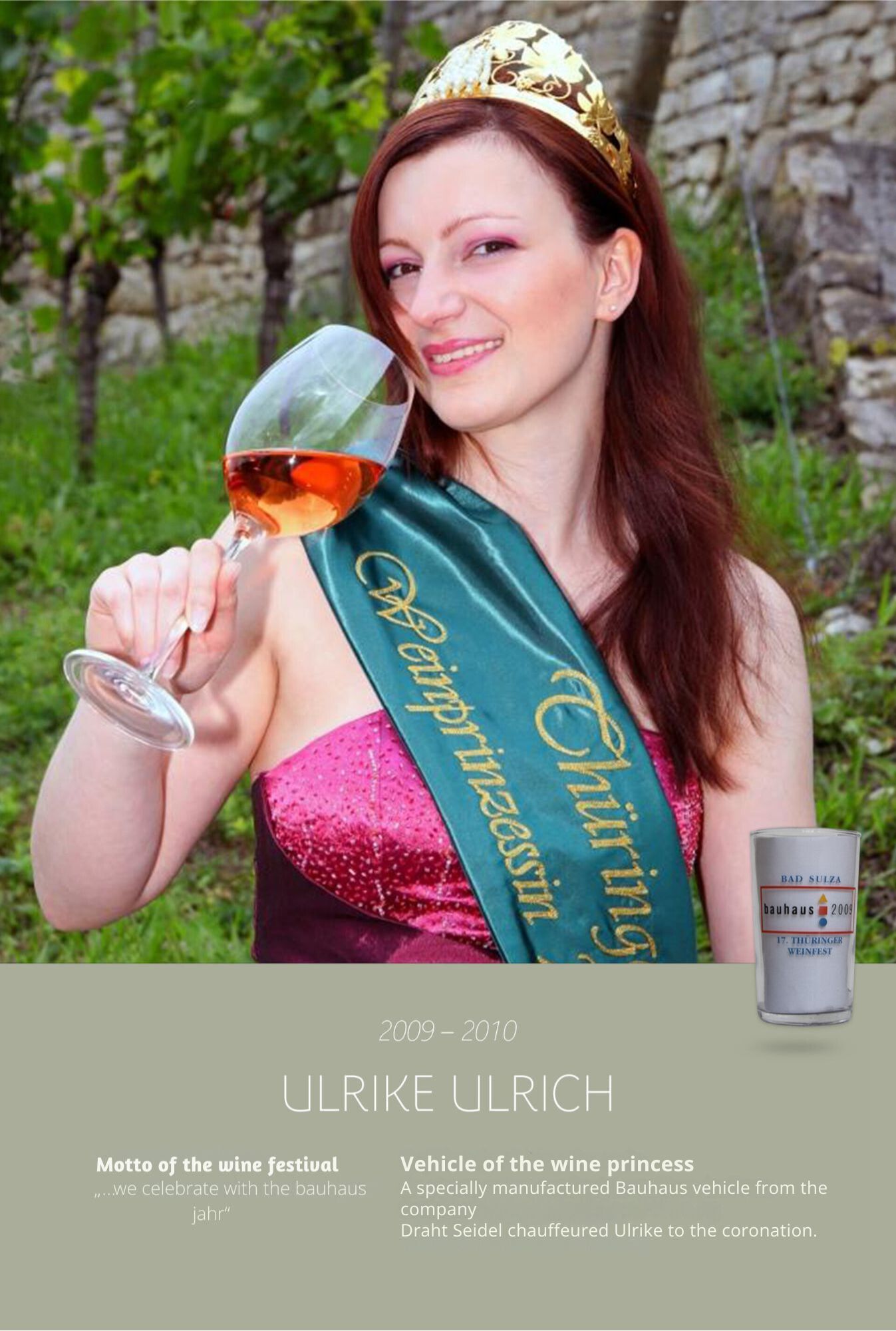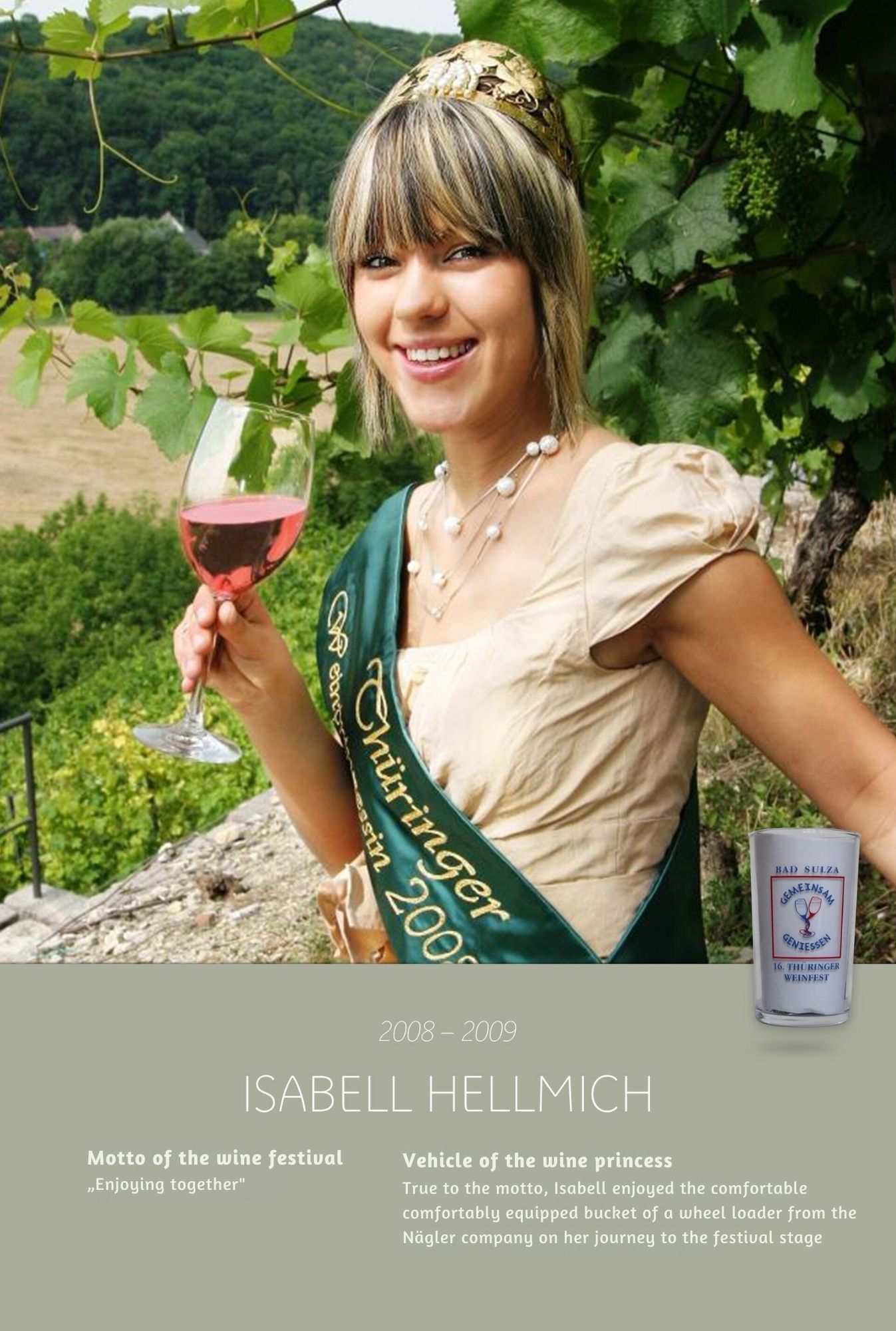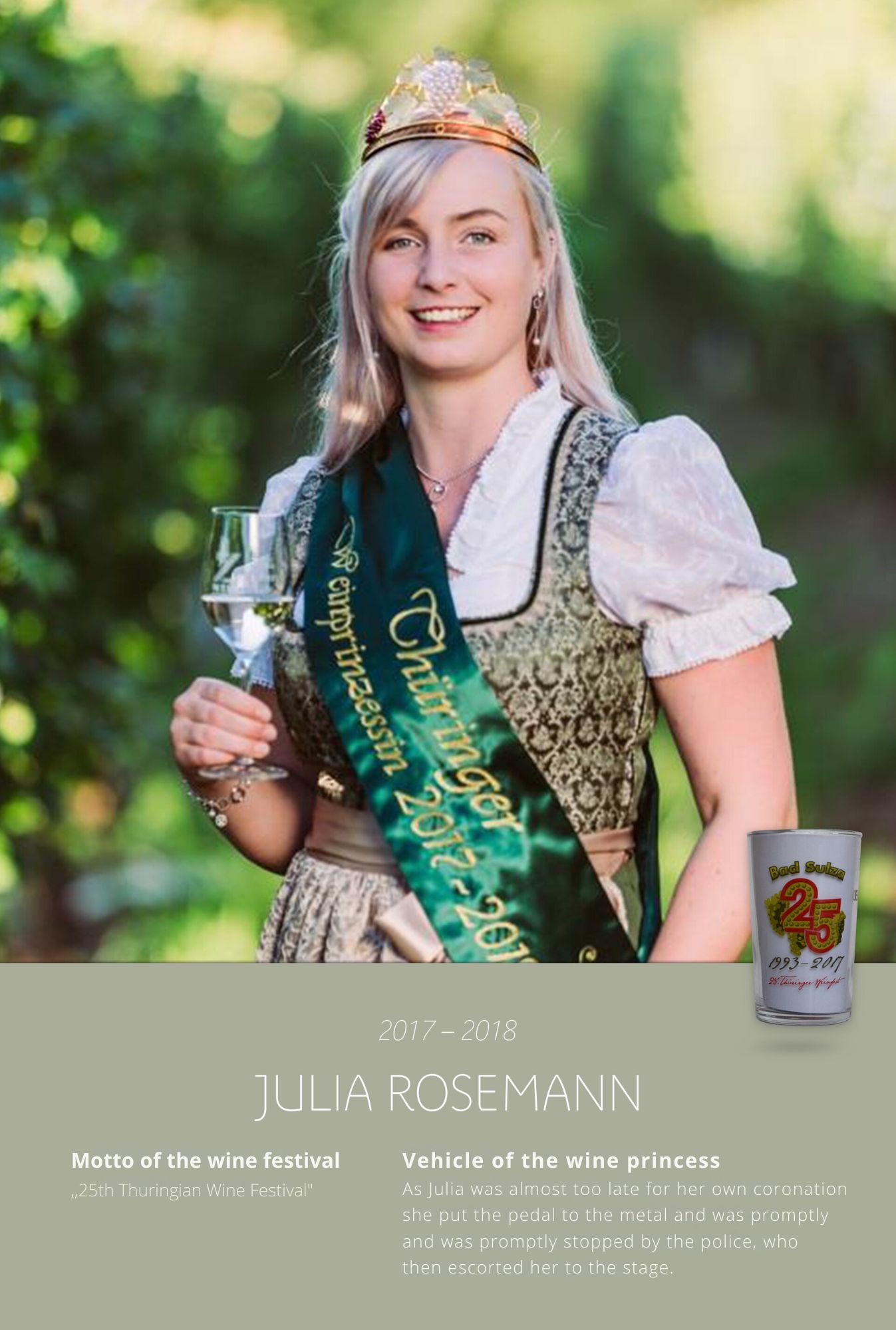 Since the first wine festival in 1993, nearly 30 Thuringian wine princesses have had the honour of wearing a crown and, during their reign, representing Thuringian wine and the wine town of Bad Sulza at numerous events.
