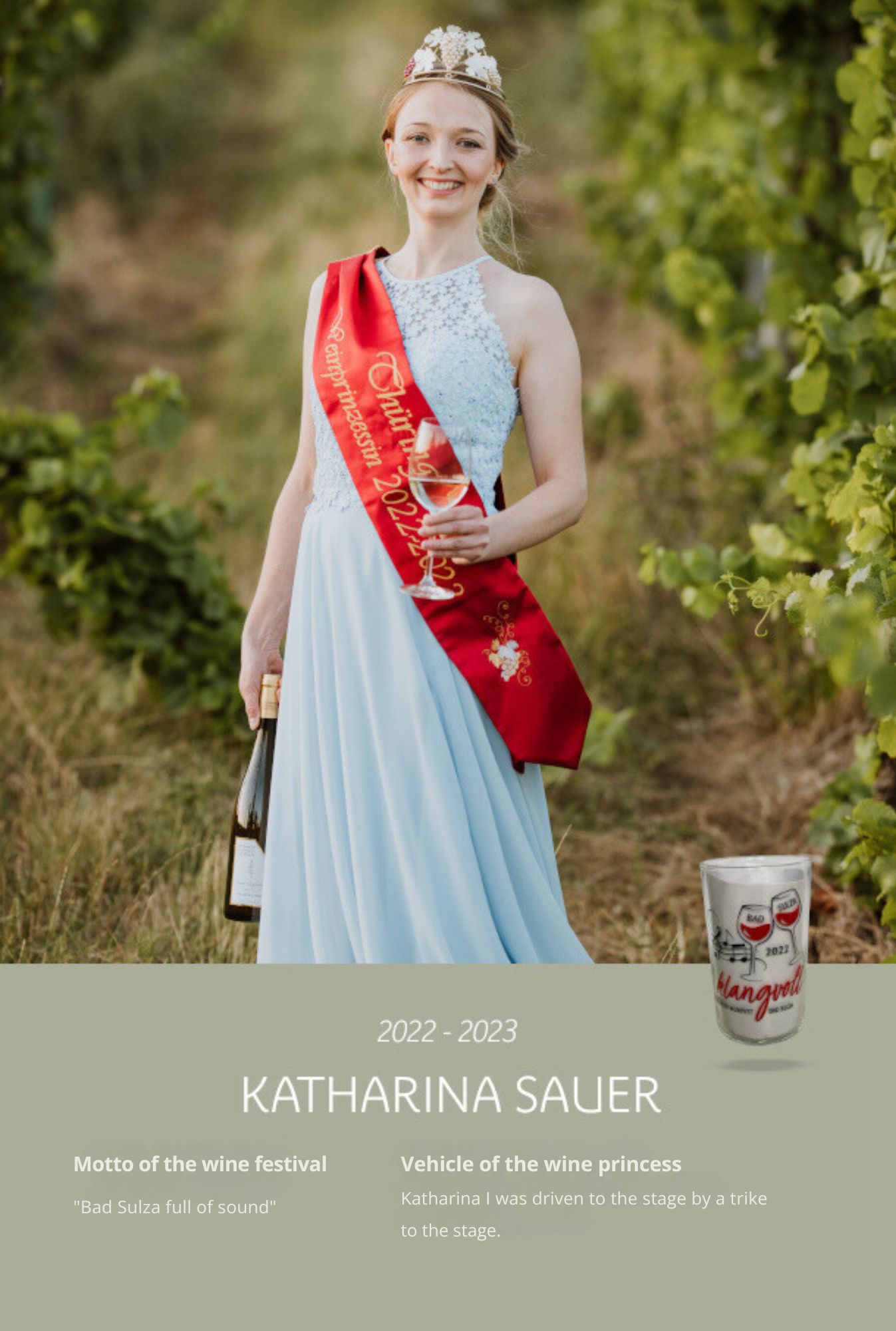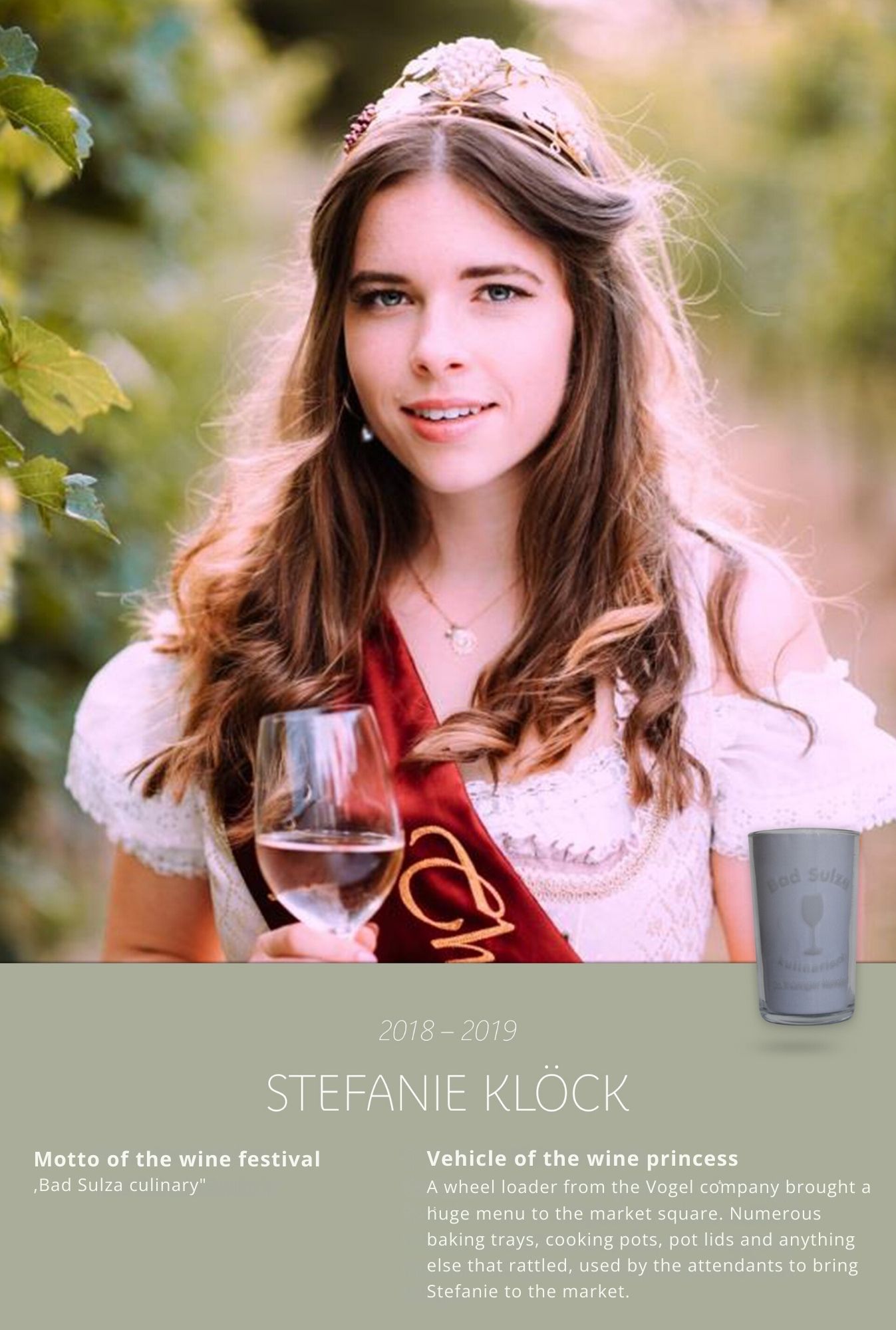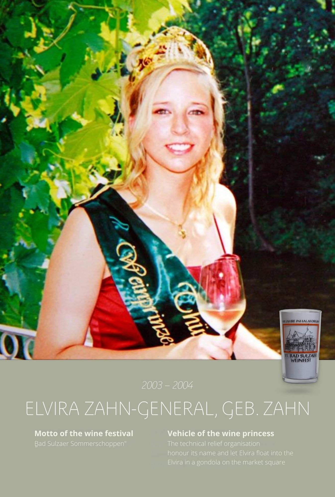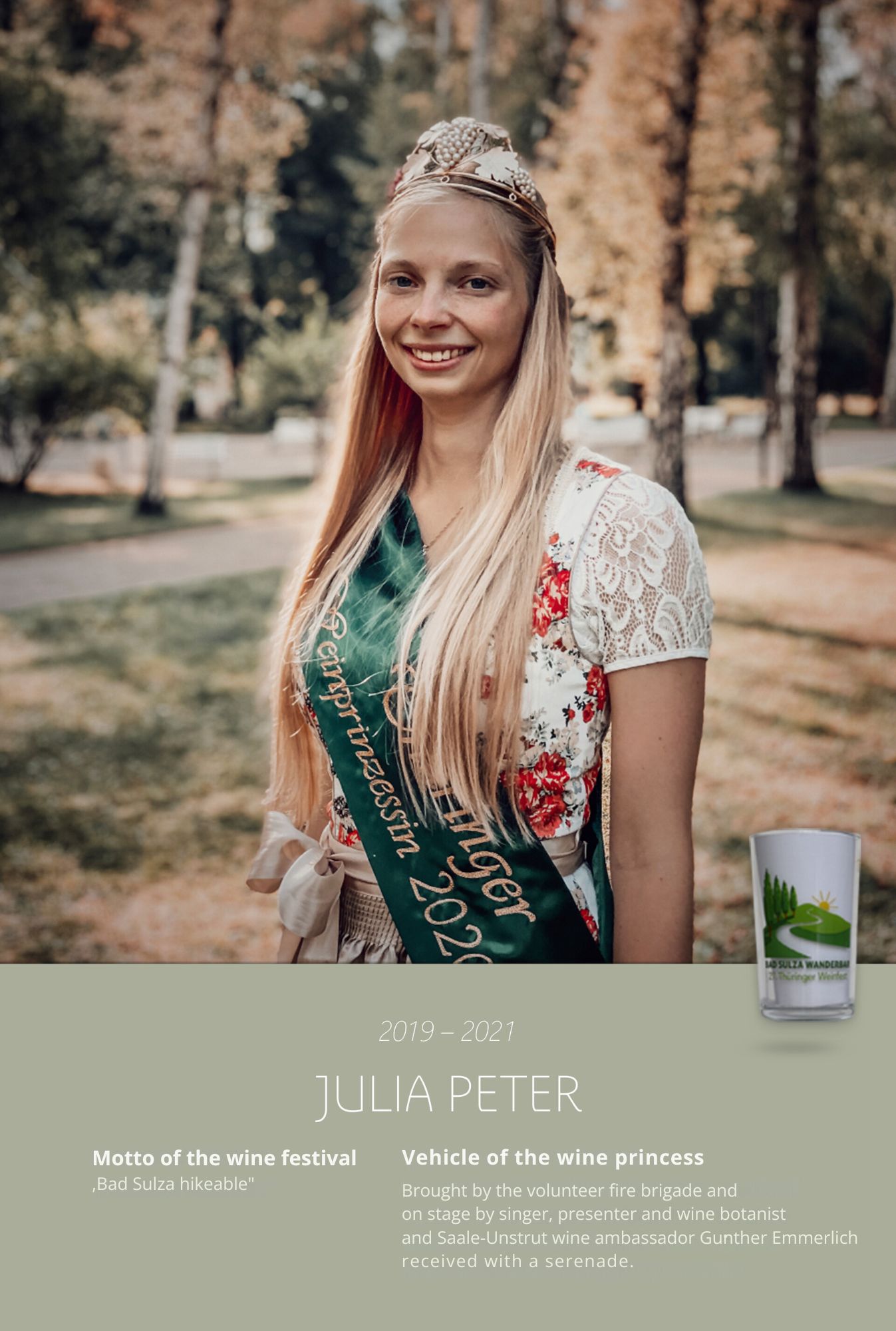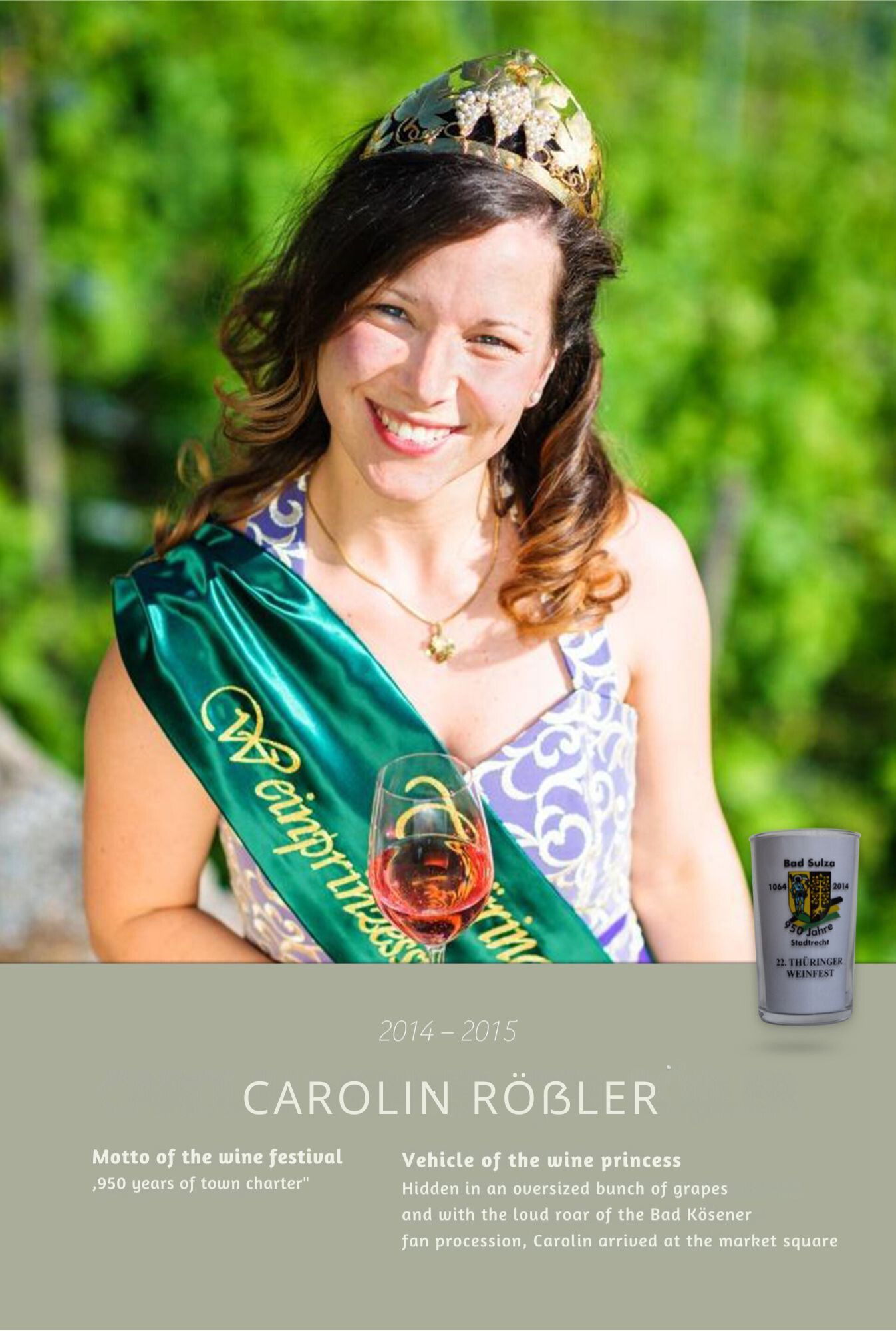Since the first wine festival in 1993, nearly 30 Thuringian wine princesses have had the honour of wearing a crown and, during their reign, representing Thuringian wine and the wine town of Bad Sulza at numerous events.