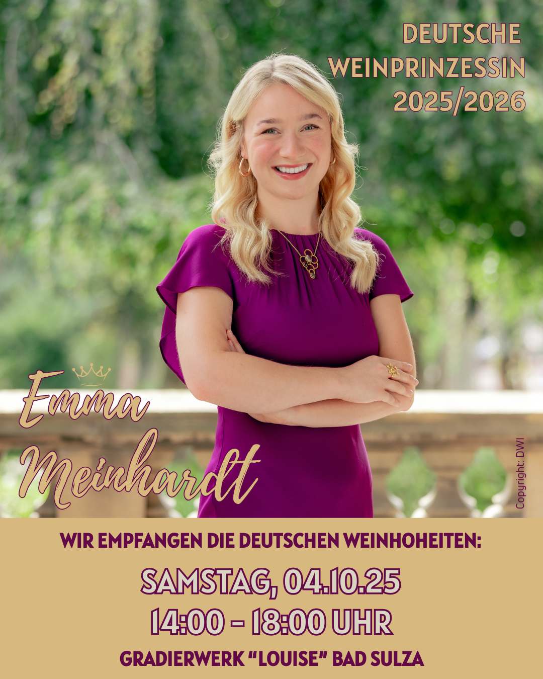 Für Bad Sulza und die Region ist diese Krone ein tolles Aushängeschild. Emma ist die erste Thüringerin mit einer Deutschen Weinkrone. Wir können voller stolz berichten, dass wir am Samstag, den 04. Oktober 2025 von 14:00 bis 18:00 Uhr die frisch gekrönten Deutschen Weinhoheiten in Bad Sulza am Gradierwerk „Louise“ begrüßen dürfen.