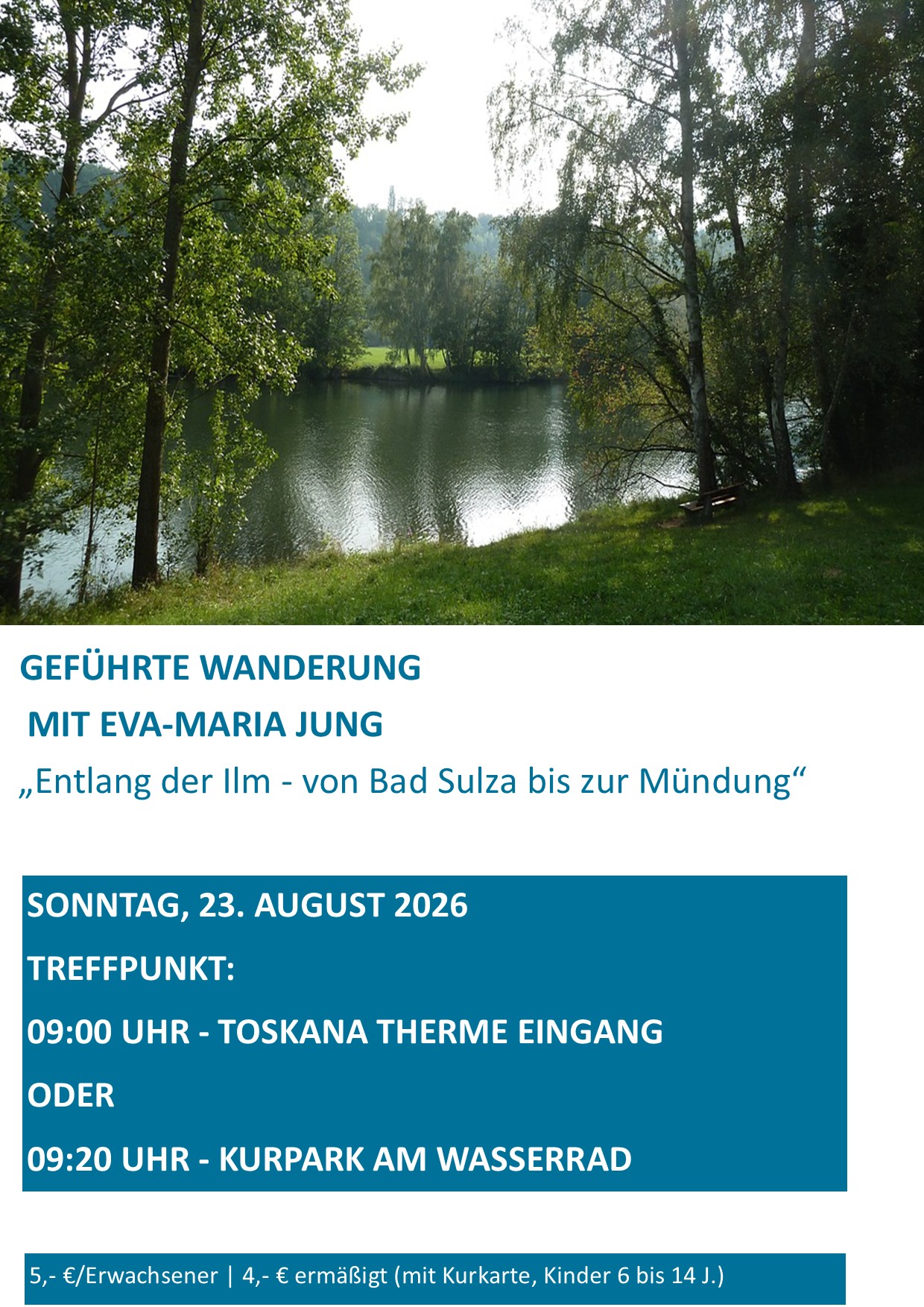 Treffpunkt: 09:00 Uhr Eingang Toskana Therme, 09:20 Uhr Wasserrad im Kurpark