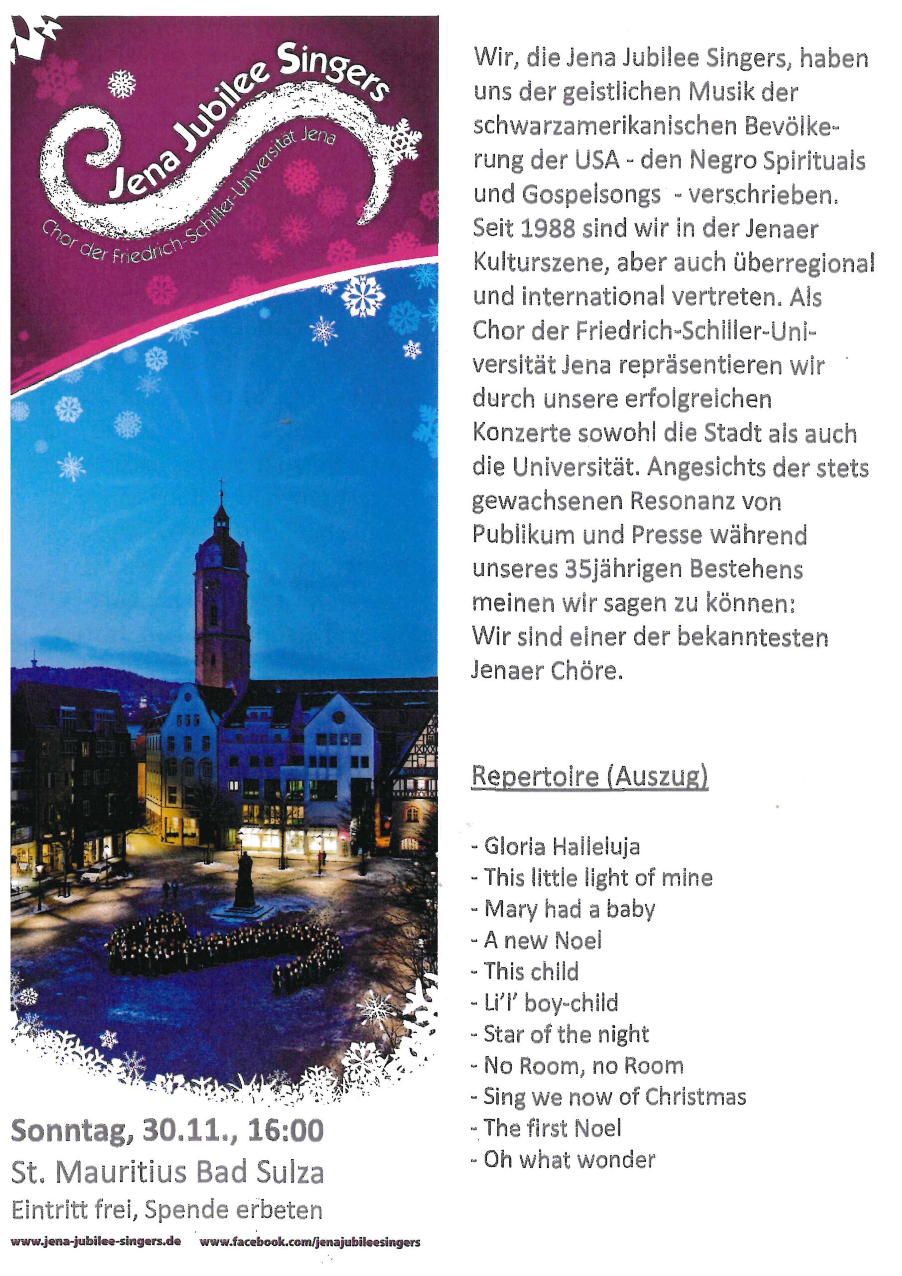 Weihnachtskonzert in der Stadtkirche St. Mauritius Bad Sulza kostenfrei, Spenden erbeten