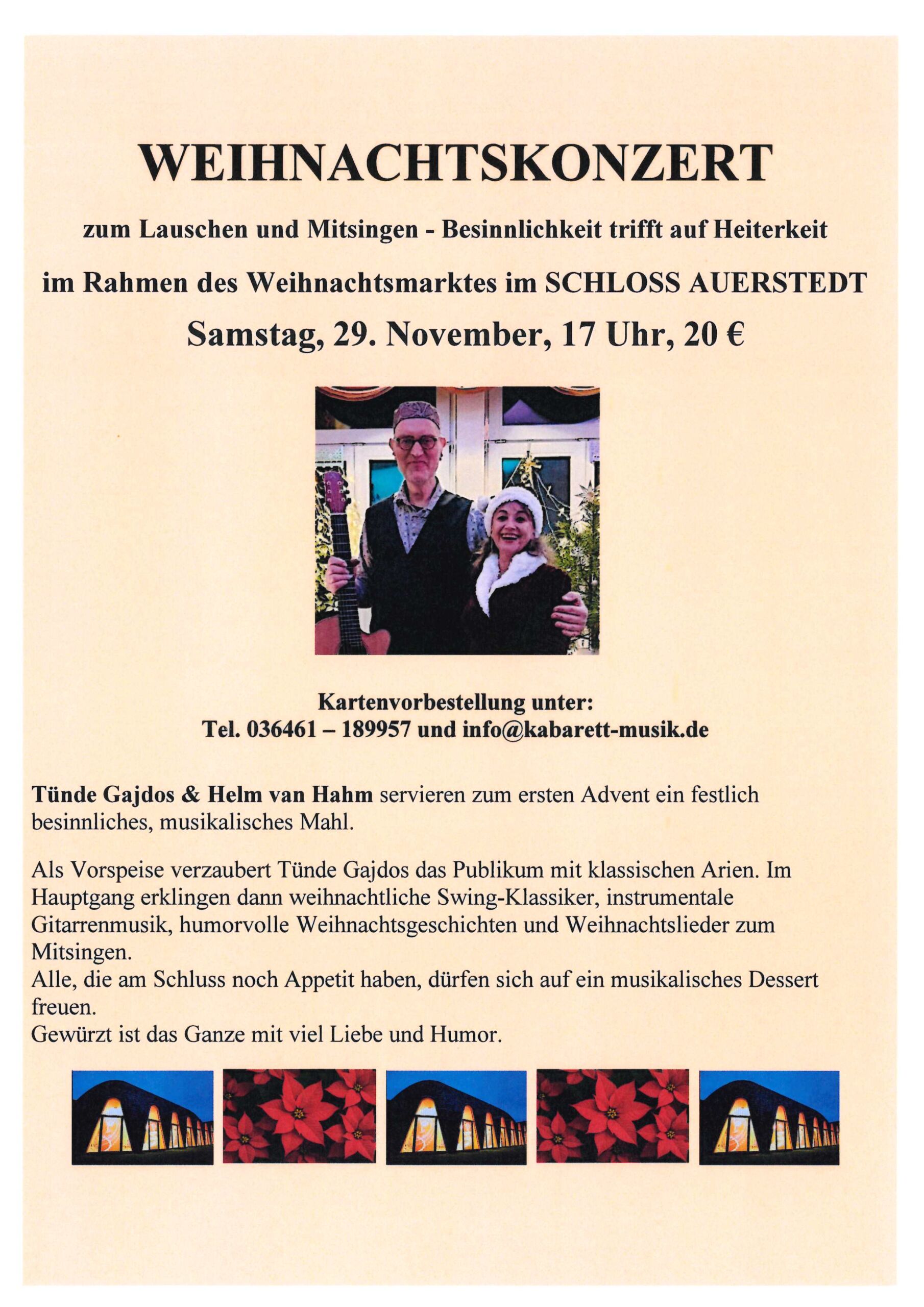 im Rahmen des Weihnachtsmarktes im Schloss Auerstedt Tünde Gajdos und Helm van Hahm servieren zum 1. Advent ein festliches besinnliches, musikalisches Mahl. Klassische Arien, Swing-Klassiker, Gitarrenmusik, humorvolle Weihnachtsgeschichten und Weihnachtslieder. Karten unter 036461 189957 oder info@kabarett-musik.de