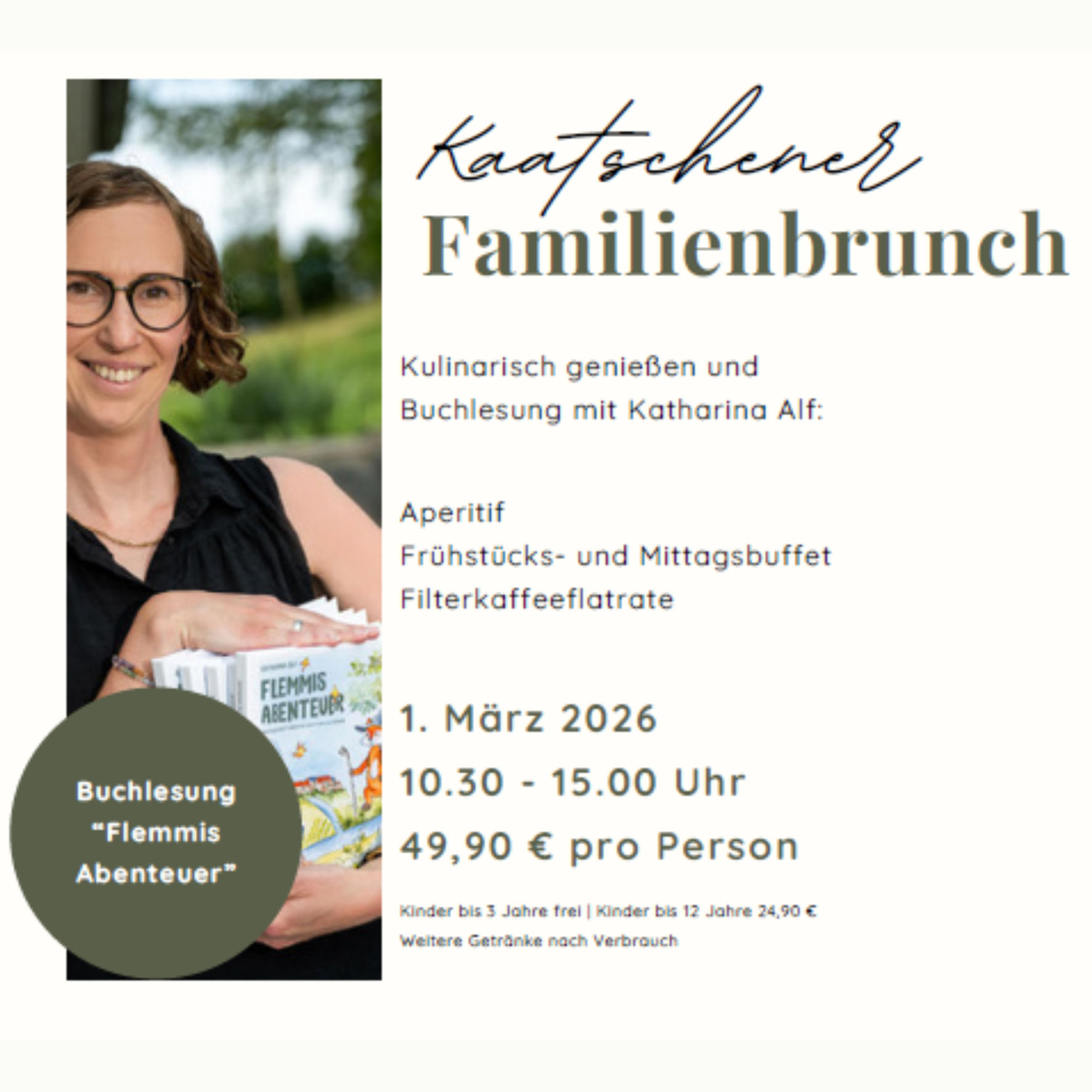 Kulinarisch genießen und Buchlesung mit Katharina Alf "Flemmings Abenteuer" Aperitif, Frühstücks- und Mittagsbuffet, Filterkaffeeflatrate Kinder bis 3 Jahre frei, Kinder bis 12 Jahre 24,90€ Reservierung unter office@ursprung.de oder telefonisch unter 034464 368848