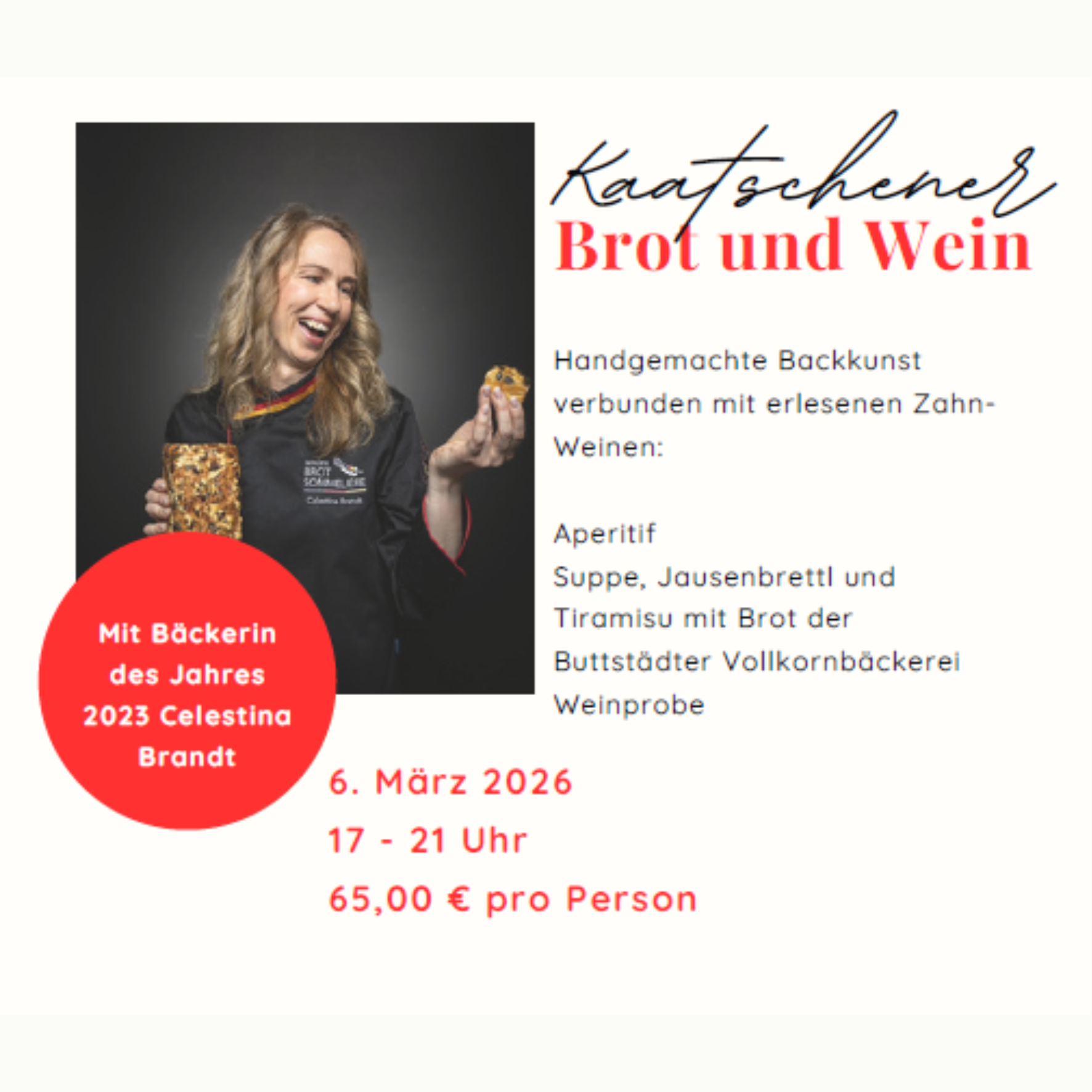 Handgemachte Backkunst verbunden mit erlesenen Zahnweinen: Aperitif, Suppe, Jausenbrettl und Tiramisu mit Brot der Buttstädter Vollkornbäckerei Reservierung unter: office@ursprung.de oder 034464 368848